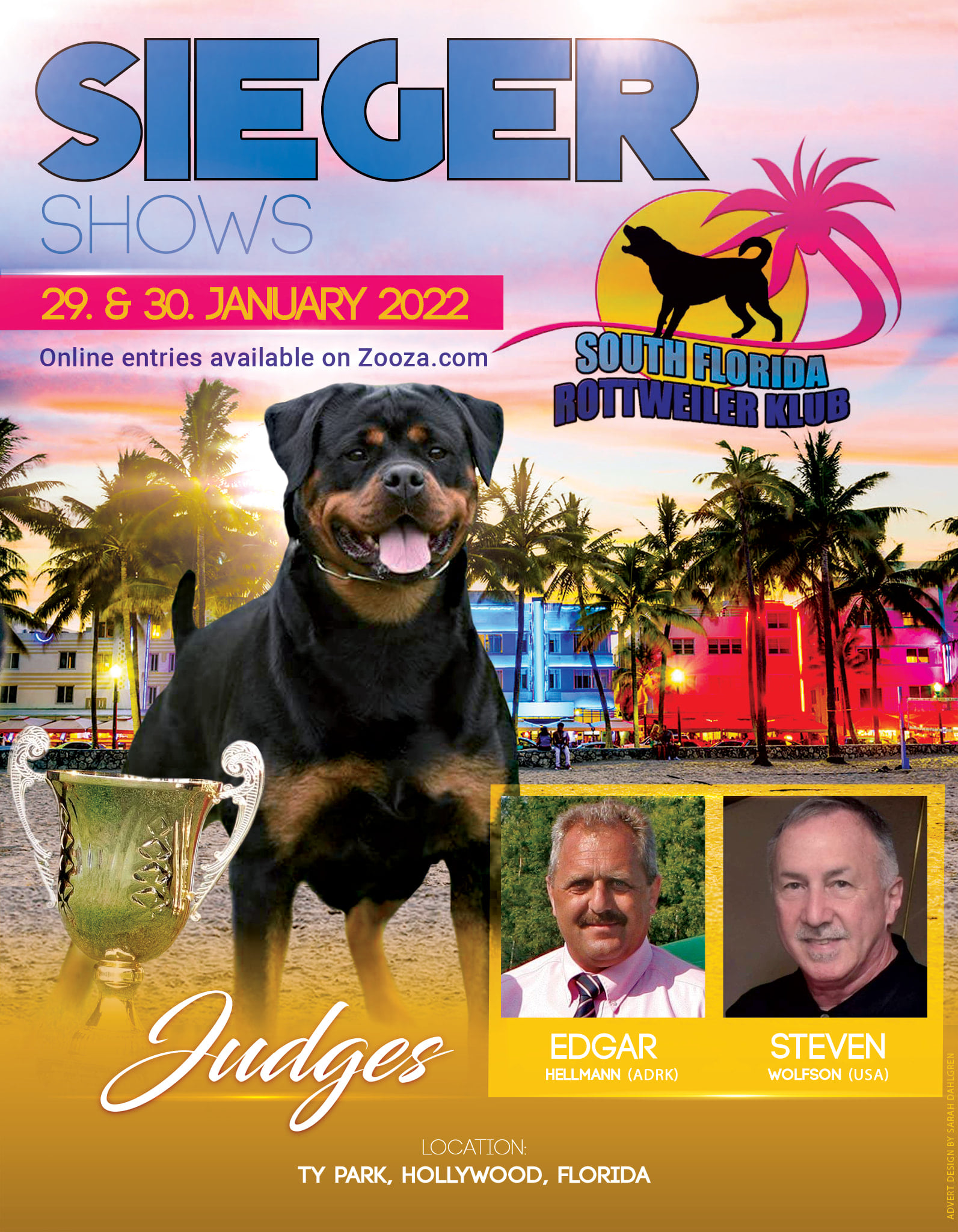 South Florida Rottweiler Klub & AIRK would like to invite all Rottweiler friends and fans to our anual Sieger Shows, SE & ZTP on January 29-30, 2022, at TY Park in Hollywood, Florida.